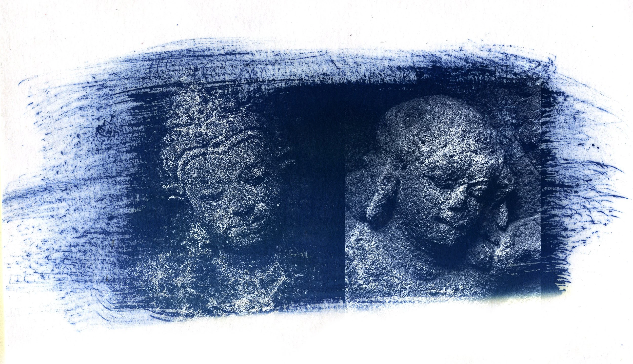 The work immediately drew my attention for its quiet yet insistent meditation on image-making as a temporal, material, and cultural act. Composed using cyanotype—a nineteenth-century photographic process—Two Faces resists the immediacy and frictionless reproducibility that characterise much of today’s digital imagery. Instead, it foregrounds slowness, touch, and the physical conditions of production.